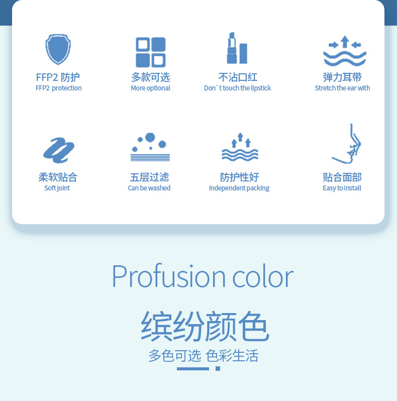 彩色FFP2口罩(非医用) 欧盟CE证书,欧洲EN149检测报告,SGS Rohs检测报告等 资质证书齐全,符合出口标准